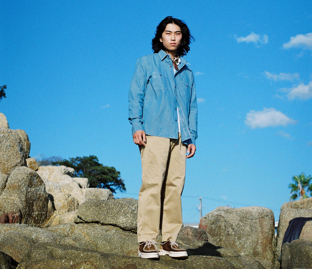 Notre chemise est fabriquée avec un chambray japonais 100 % coton de chez Collect. Cet atelier très réputé fabrique notre tissu indigo sur des métiers à tisser traditionnels dans la région d’Okayama.