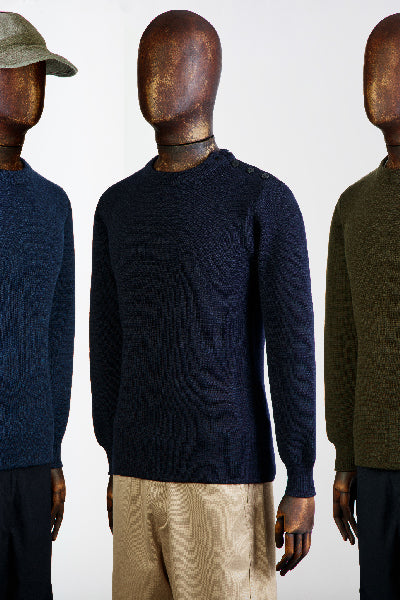 Pull marin français réinterprété en laine vierge d'agneau Schoeller 10, matière naturelle durable offrant résistance aux intempéries et douceur exceptionnelle. Tricotage artisanal traditionnel avec col et poignets double épaisseur pour protection renforcée. Assemblage sur machine industrielle Complett Type HS.K VD pour coutures précises et durables.